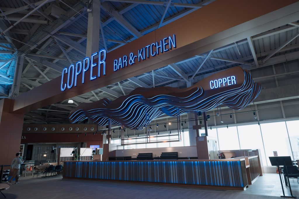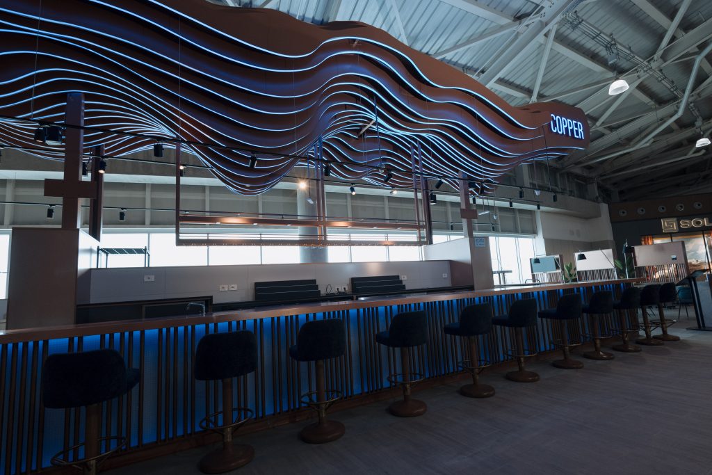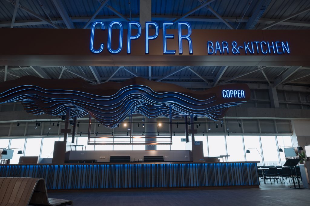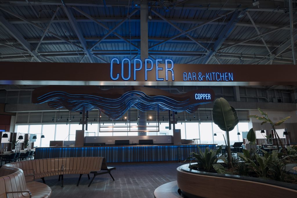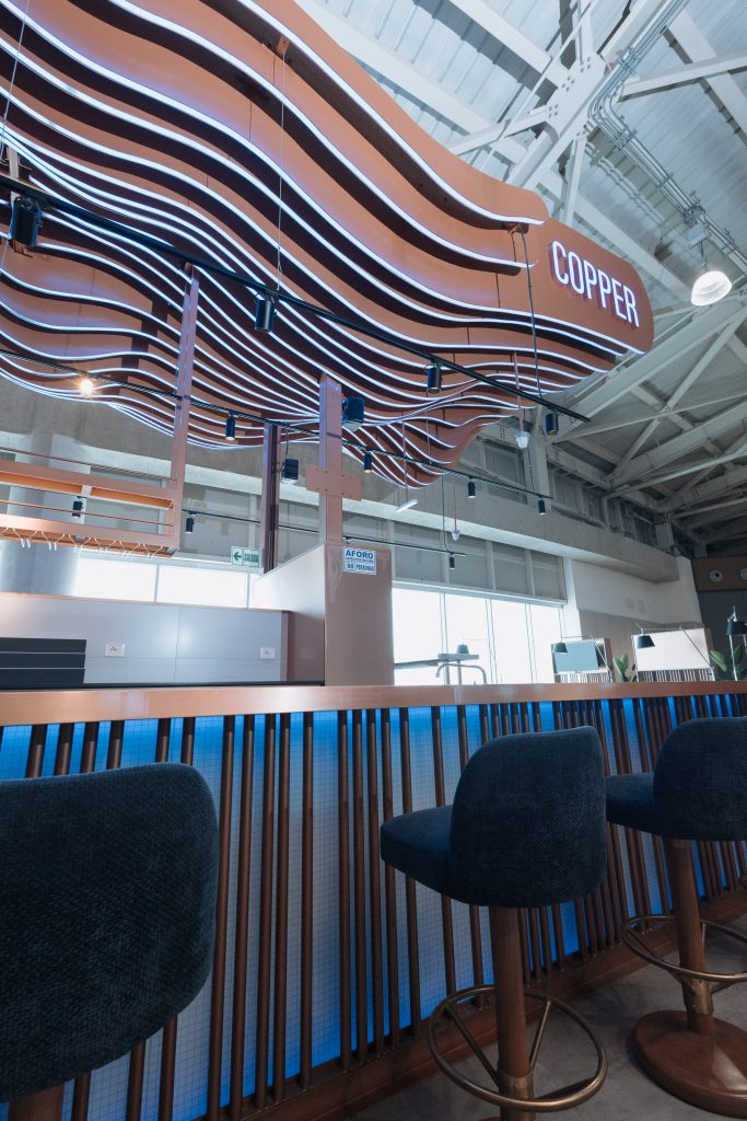 Copper es una barra icónica de mixología, inspirada en los alambiques de cobre utilizados en la destilación de bebidas andinas como el pisco y la malta. El diseño propone un ambiente de relajación pre-embarque, con una coctelería de autor que combina sabores peruanos auténticos e internacionales, acompañada de entradas y bocadillos gourmet