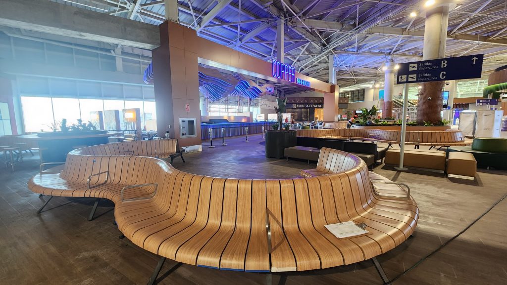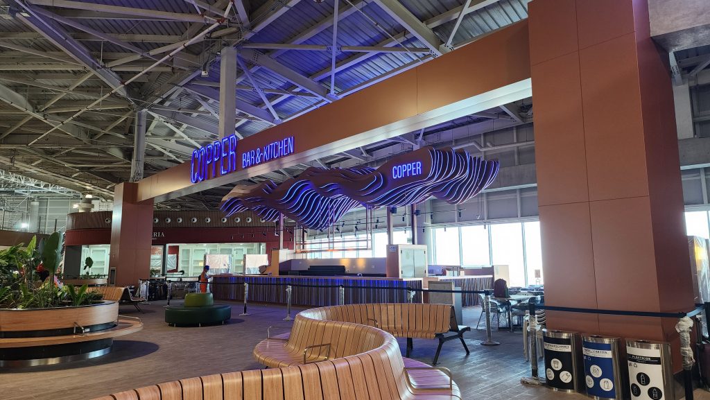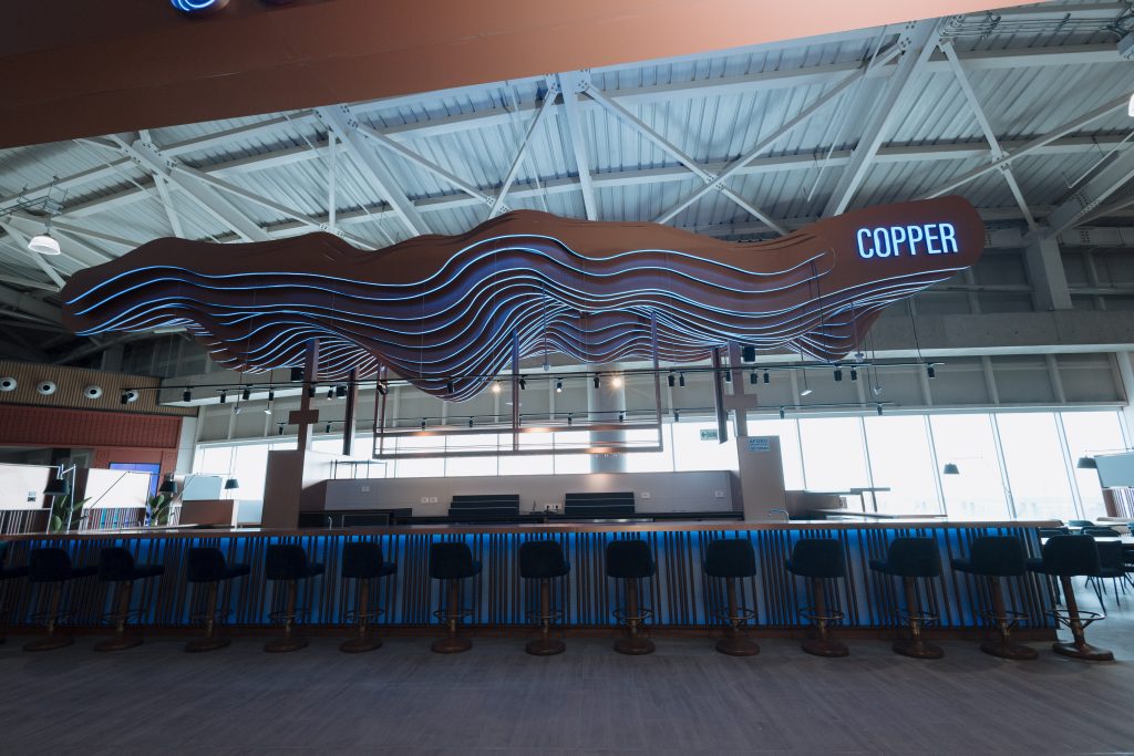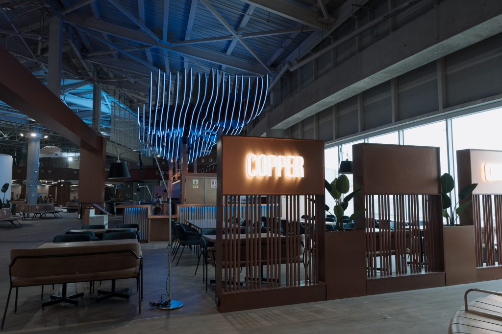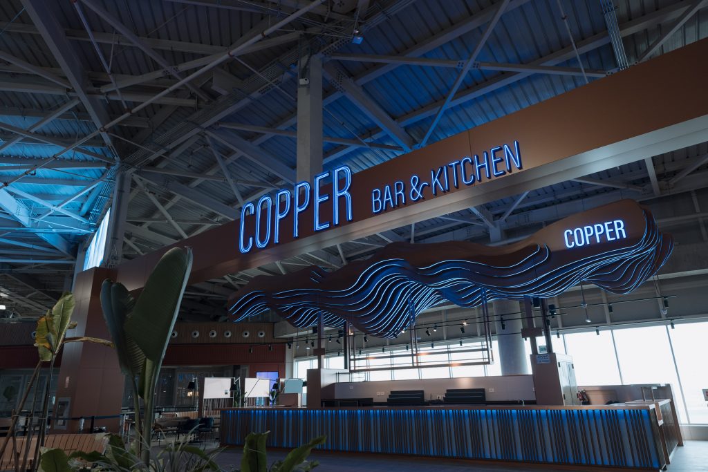 Copper es una barra icónica de mixología, inspirada en los alambiques de cobre utilizados en la destilación de bebidas andinas como el pisco y la malta. El diseño propone un ambiente de relajación pre-embarque, con una coctelería de autor que combina sabores peruanos auténticos e internacionales, acompañada de entradas y bocadillos gourmet