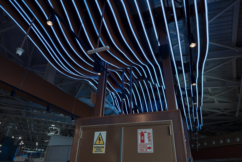 - Geometría y modularidad: La composición se basa en volúmenes limpios y repetición rítmica de líneas, visible en la barra central de base metálica y en los paneles suspendidos que estructuran el espacio.