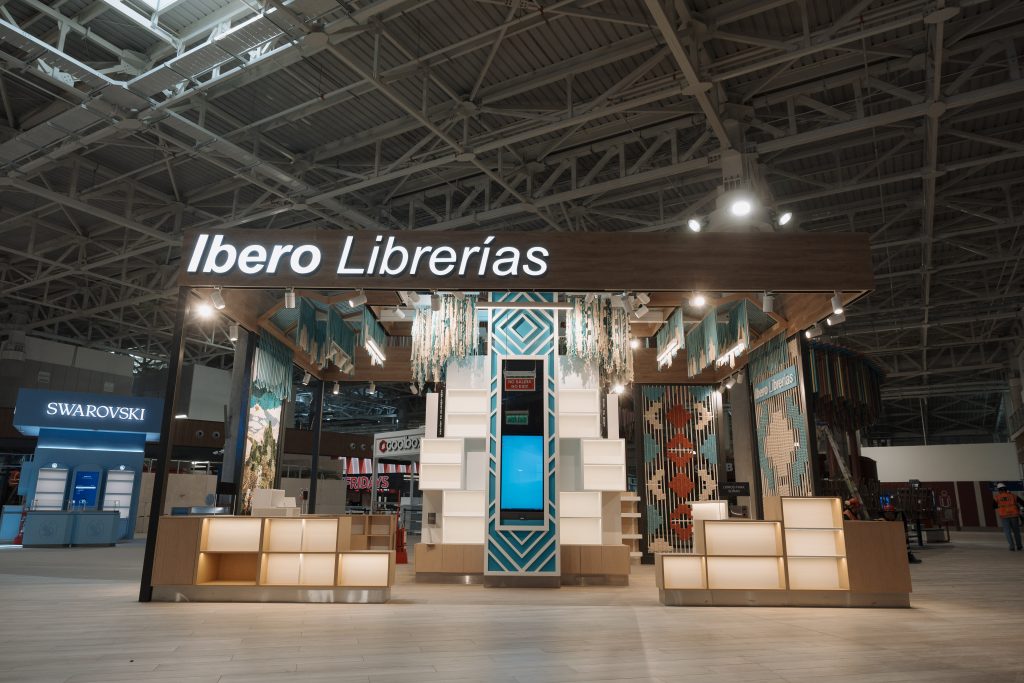 El diseño incorpora una cubierta liviana de madera tipo alistonado, que remata la composición con una marquesina sobria, sobre la cual se ubica la marca “Ibero Librerías” retroiluminada, visible desde la distancia, cumpliendo una función de hito visual en el recorrido del pasajero.