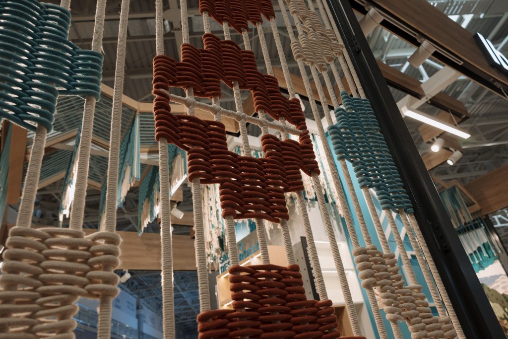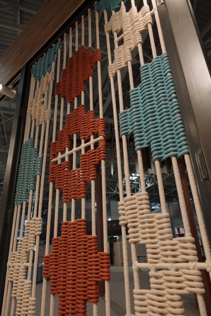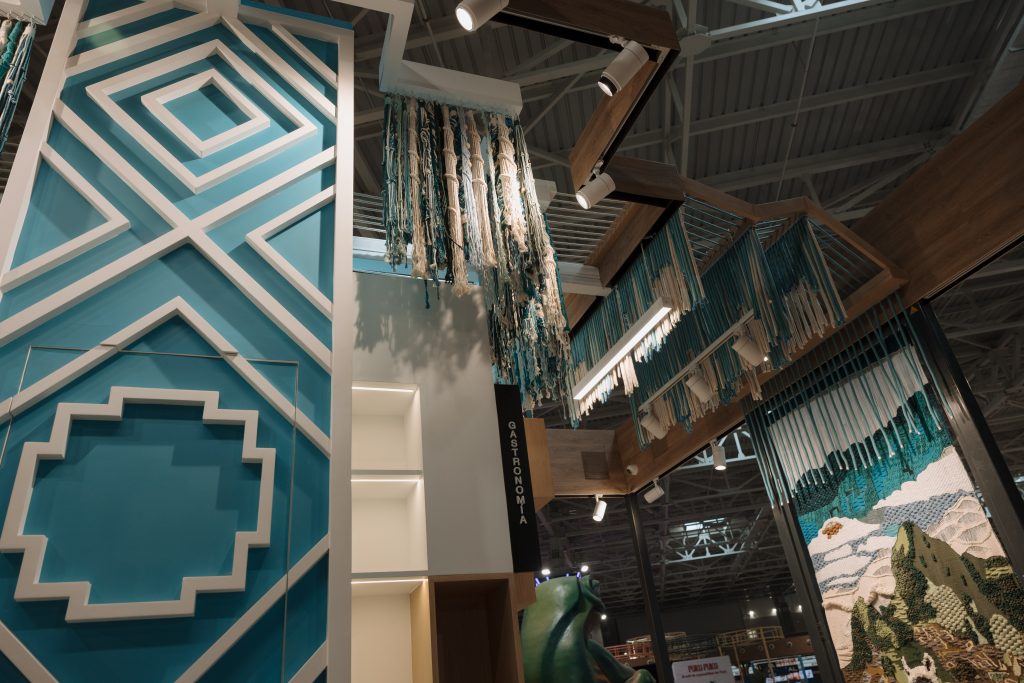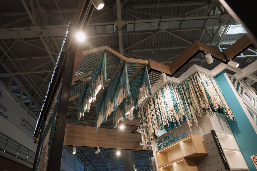 Uno de los grandes protagonistas del proyecto son los tapices tejidos a mano, integrados a modo de paneles murales. Estas piezas —diseñadas en colaboración con artistas locales— representan paisajes y símbolos peruanos, como la llama andina o la montaña, generando un puente entre la cultura y el espacio arquitectónico. Estos elementos transforman el módulo en una instalación viva, que comunica sin palabras