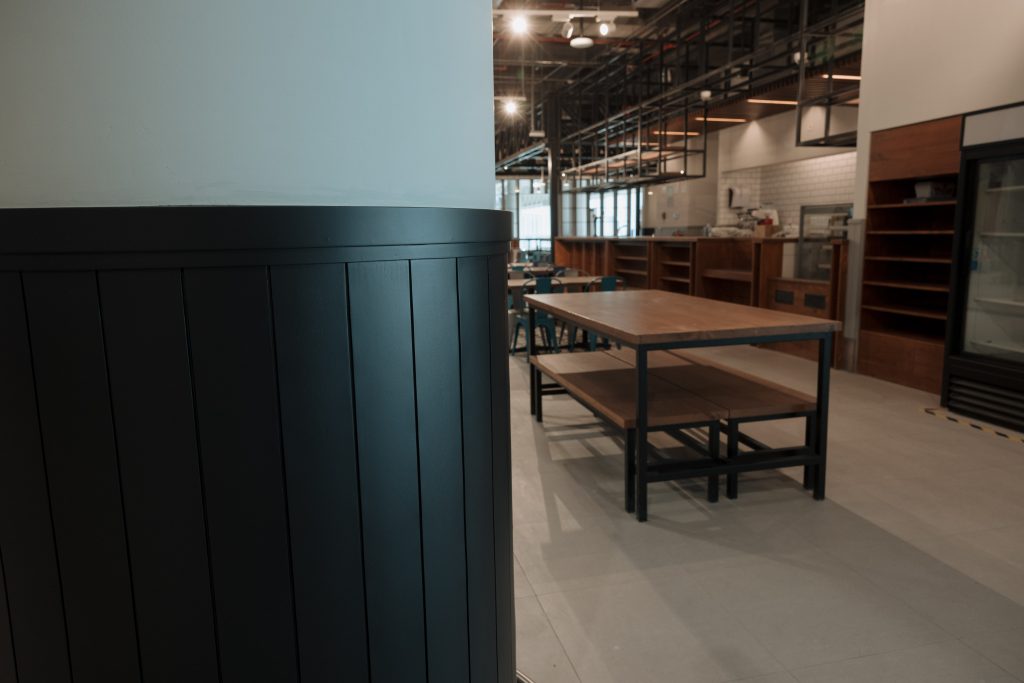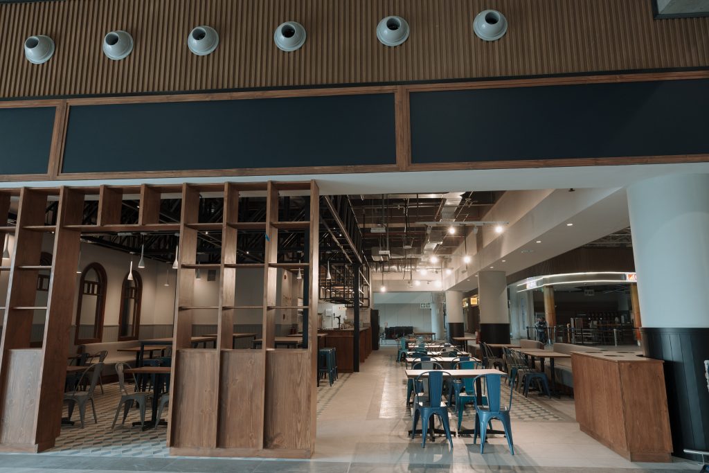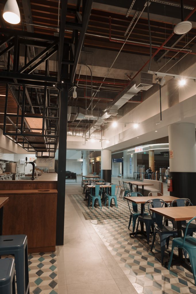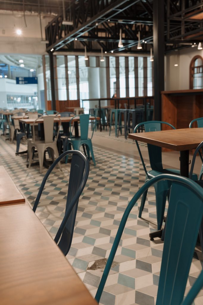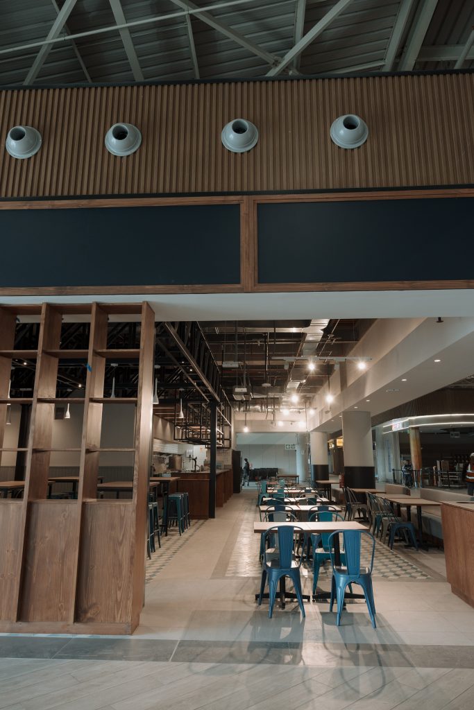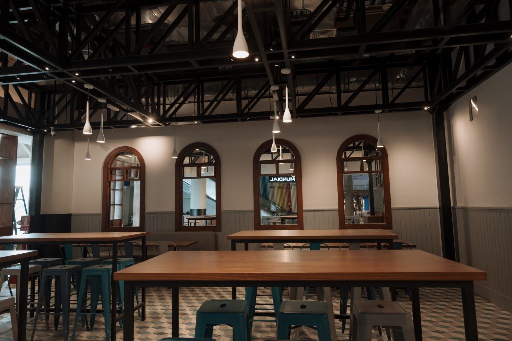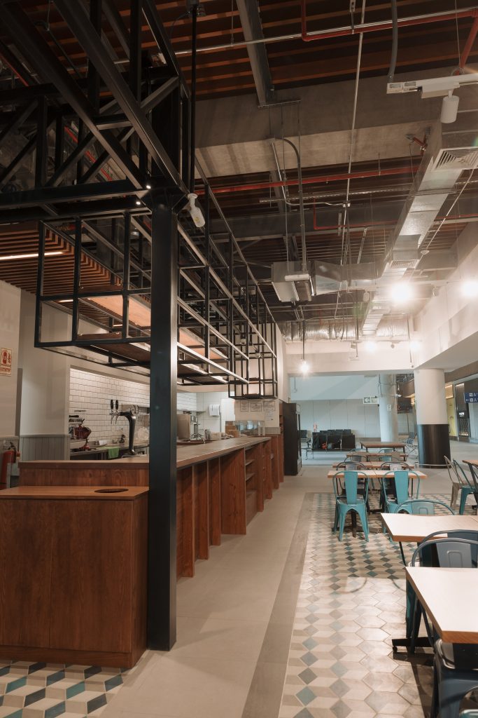 En el interior, se despliega un ambiente industrial moderno con materiales como madera natural, estructuras metálicas negras y baldosas geométricas en el piso, que delimitan el área de mesas sin necesidad de muros. El mobiliario combina elementos metálicos con tonos cálidos en madera, aportando un contraste visual armonioso y funcional.